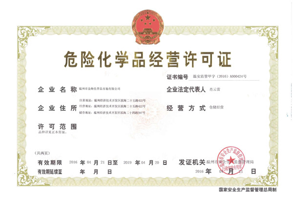 4月22日,溫州市金?;瘜W品市場順利取得由市安監(jiān)局頒發(fā)的《危險化學品經營許可證》。標志著金?;瘜W品市場正式獲得國家?;穫}儲管理的資質認可,從此具有了正常營業(yè)的資格。